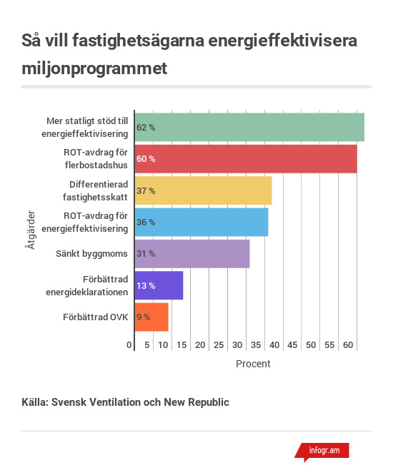 Samtidigt bedömer drygt 60 procent av fastighetsägarna att mer statligt stöd är av betydelse. Lika många vill att ROT-avdrag ska kunna användas även för åtgärder i flerbostadshus. Drygt var tredje tror också att ett ROT-avdrag som anpassas för energieffektiviseringsåtgärder skulle ha en positiv effekt.
