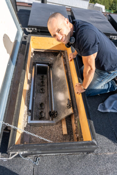 André Eklund öppnar en dörr på ett aggregat och visar frånluftsvärmepumpen med sina kyl- och värmebatterier. Att ha allting samlat här på taket var inte det enda alternativet. En konsult föreslog att ha värmepumpen i källaren och enbart ett traditionellt frånluftsaggregat på taket.