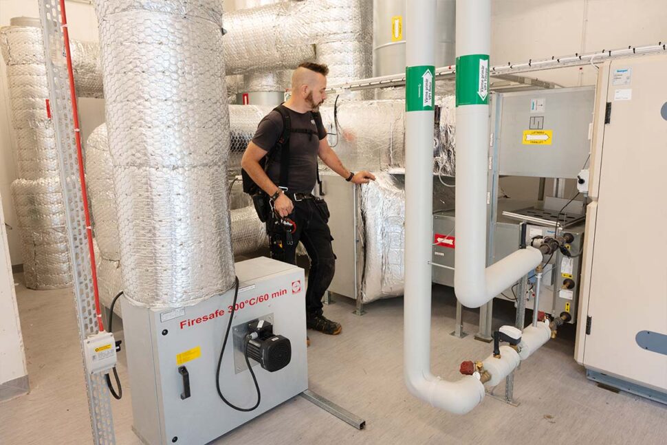 – Den här förskolan är fantastisk, man har tänkt bra redan från början så det är väldigt lite bekymmer, säger han när vi kliver in i fläktrummet. Allt är i sin ordning även nu.