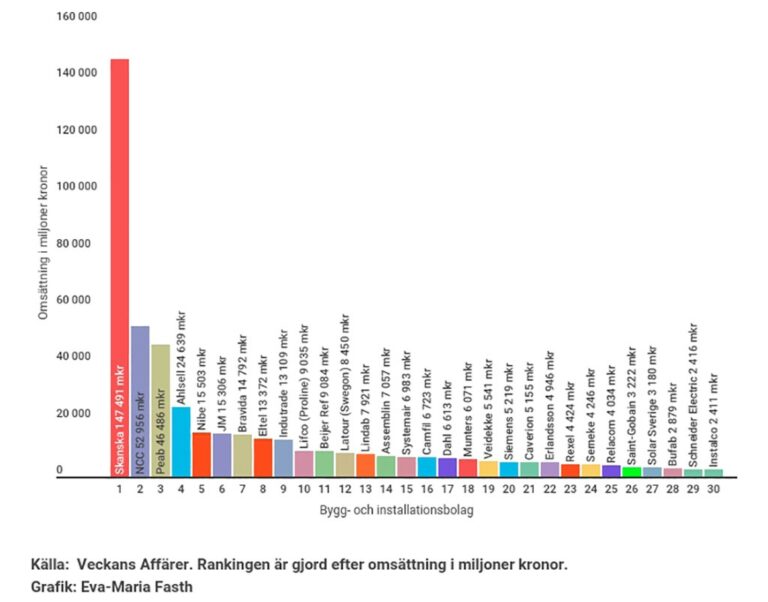 UPPDATERAD. 30 bygg-och installationsbolag finns med bland landets största företag, sett till omsättningen. Det visar Veckans Affärers ranking av landets 500 största företag i Sverige 2017.