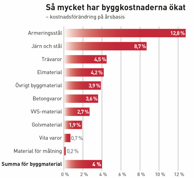 PÄ ett Är har byggkostnaderna ökat med 2,7 procent. Priserna pÄ elmaterial, men Àven VVS-material har blivit dyrare.